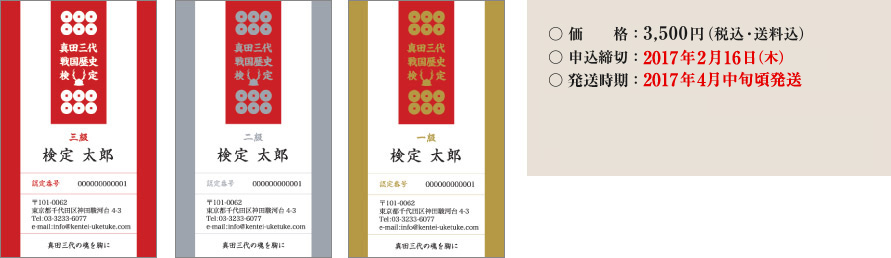 お申し込み後に、写真貼付表にヨコ2.5cm×タテ3cmの顔写真を貼付し、氏名・認定番号・認定級をご記入の上、真田三代戦国歴史検定運営事務局まで送付してください。